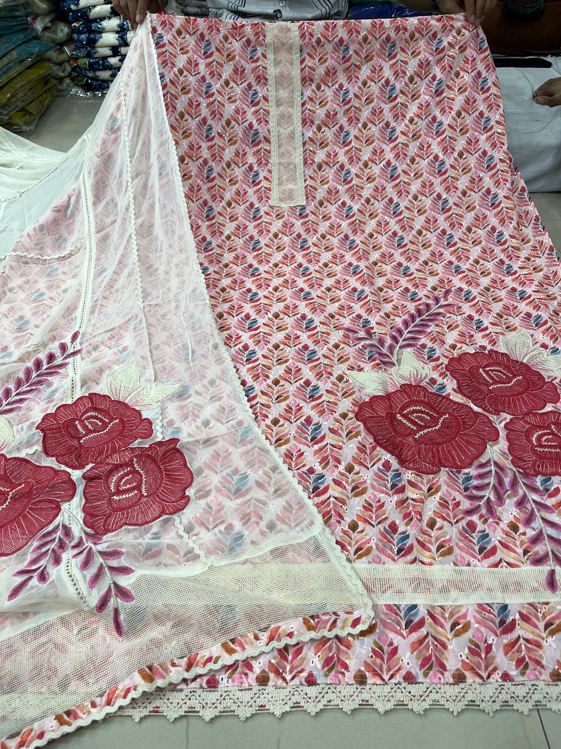 Chicken Digital Print Embroidered Suit with Cotton Bottom & Chiffon Patch Embroidered Dupatta